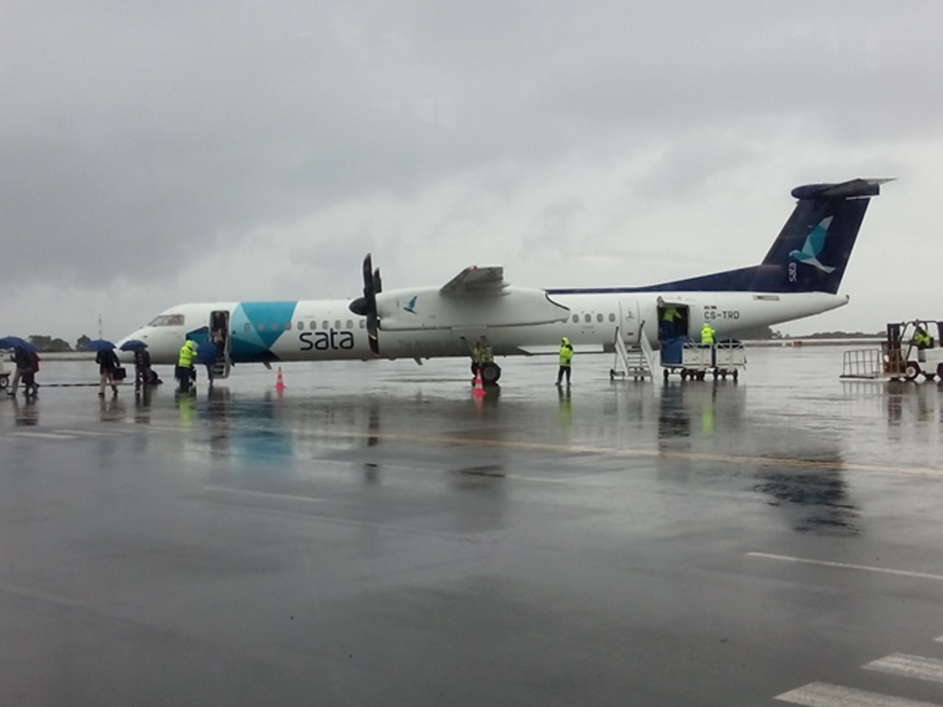 Geflogen sind wir mit einem Flugzeug mit 80 Plätzen, wir waren aber nur 10 Passagiere. Als es ankam, regnete es stark, deshalb wurde jedem Passagier ein aufgeklappter Regenschirm gereicht.