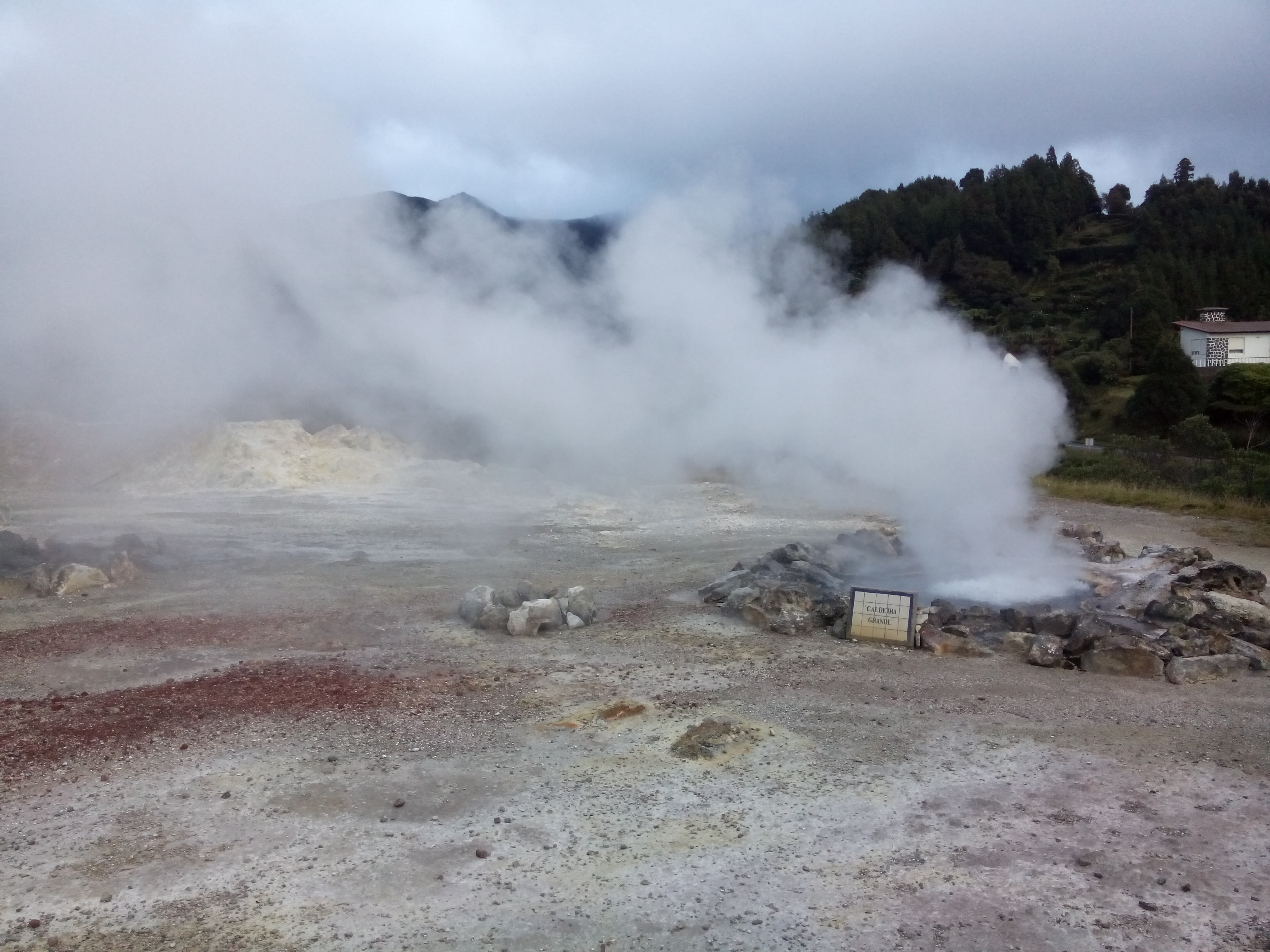 Anschließend führte uns eine steile Straße (laut Reiseführer 45%) in die Berge. Zum Glück haben wir diesmal ein starkes Mietauto. Dort bestaunten wir in Furnas noch die Dampfwolken der heißen Quellen (98 Grad). Die Gehwege waren warm und über dem Ort lag ein schwefliger Geruch.