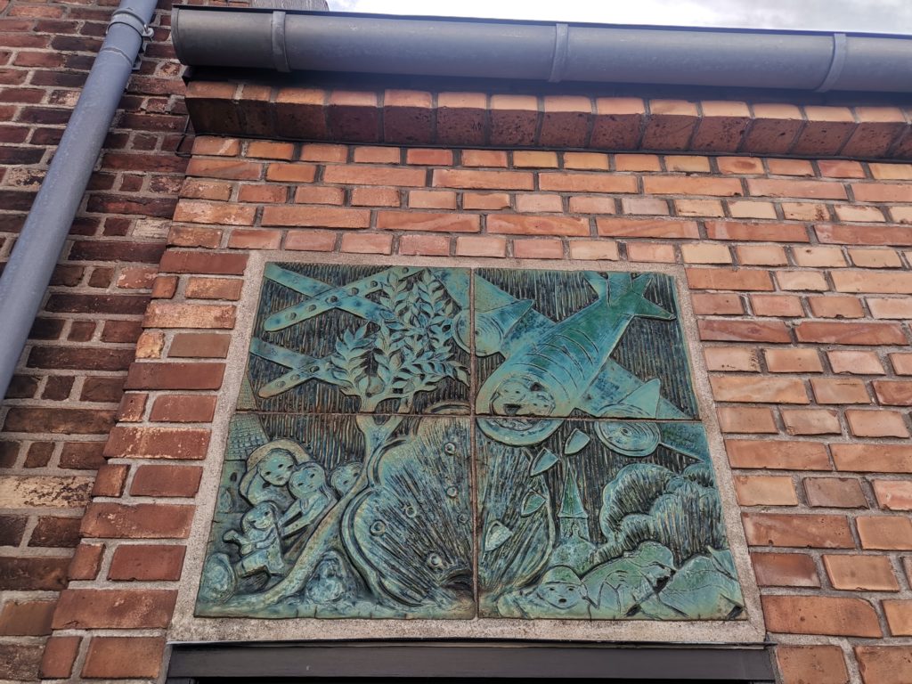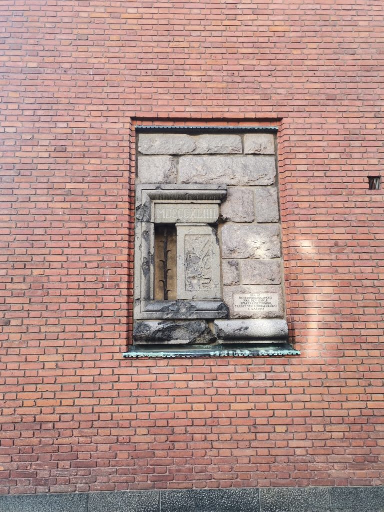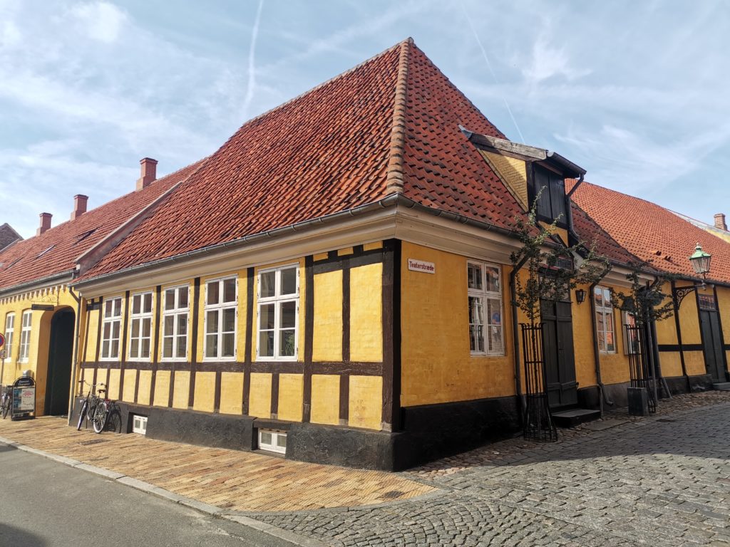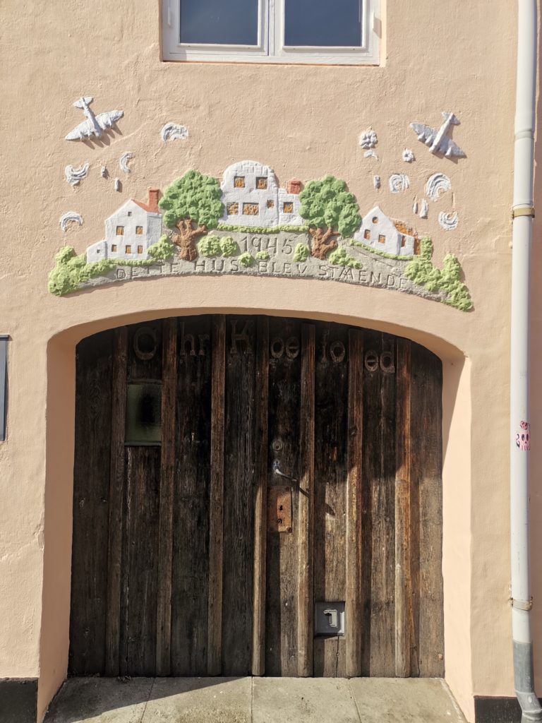 Unseren Rundgang begannen wir an der Nikolaikirche. Wenn man aus Richtung Rügen auf die Insel zufährt, grüßt der weiße Kirchenbau bereits von Weitem. Von hier aus schlängelten wir uns durch ein paar Gässchen, um erst auf dem Lille Torv (Kleiner Markt) und wenig später auf dem Store Torv (Großer Markt) zu landen. Hier herrschte geschäftiges Treiben, neben zahlreichen Touristen nutzen wohl auch die Einheimischen die Cafés für ihre Mittagspause. Auf dem Großen Markt wird an einem Bankgebäude auf das beim Bombenangriff zerstörte Vorgängergebäude hingewiesen, indem ein Bruchstück der alten Fassade in den Neubau integriert wurde.