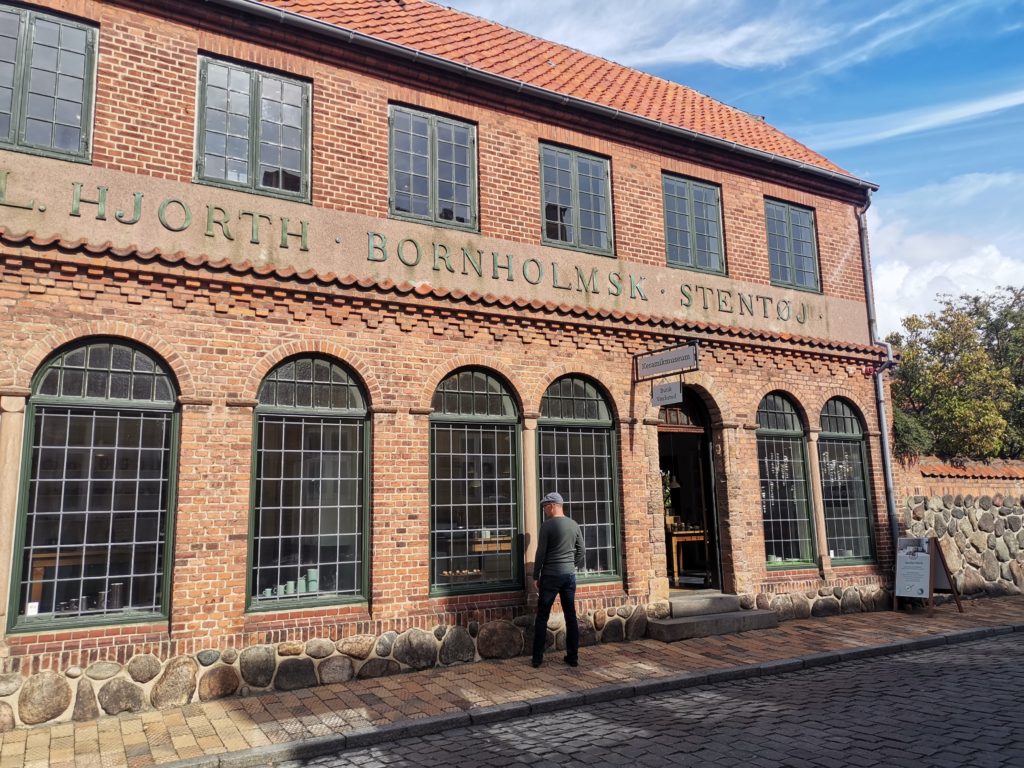 Weiter ging es durch die Straßen im Zentrum, um die schönen Häuschen zu bewundern. Unterwegs nutzten wir die Möglichkeit, bei einem Bäcker Kaffee und Kuchen zu uns zu nehmen, das hatten wir bei den bisherigen Ausflügen ja immer vermisst (Anmerkung C.: es war eher ein Keks). Wir schlenderten dann am Theater der Stadt vorbei, welches sich seit 1823 in einem umgebauten Kontorhaus befindet. Dem Keramik-Laden der Hjorths Fabrik statteten wir einen Besuch ab, haben aber auf einen Gang durch das zugehörige Museum verzichtet. Wir warfen einen Blick auf Rønnes kleinstes Haus, die Fassade besteht nur aus Haustür und zwei schießschartenähnlichen Fenstern rechts und links derselben.