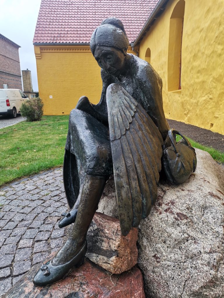 In Allinge saßen wir eine ganze Weile im Auto herum. Laut Live-Radar schien bereits die Sonne, draußen peitschte der Regen. Weiter warten. Wir waren nah dran zurück zu fahren und einen Faulenzertag einzulegen. Als der Regen etwas nachließ wollte ich mir wenigstens noch die Bronzefigur vor der Kirche anschauen. Die Skulptur war hübsch und trägt den Titel „Metamorphose“.