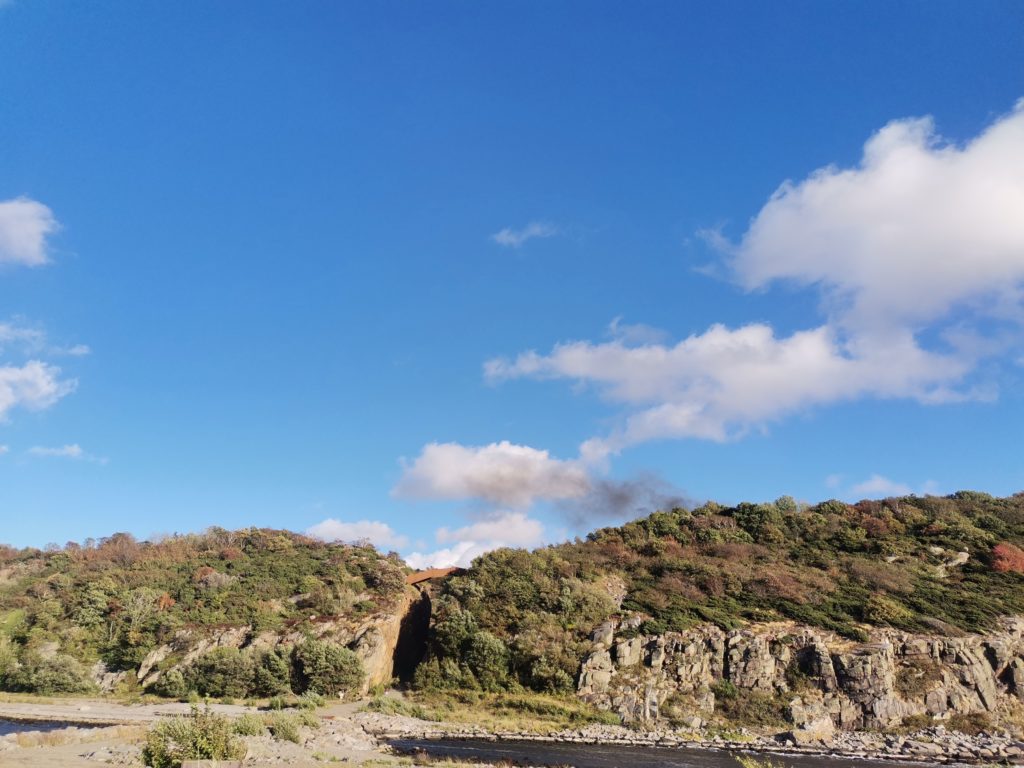 Unseren Weg zum Steinbruch selbst und weiter zu Jons Kapel konnten wir leider nicht fortsetzen. Ein auf einem Klappstuhl ruhender Mann „bewachte“ den Durchbruch zum Steinbruch und erklärte uns auf deutsch, dass dort gerade ein Film gedreht wird und dort ein Auto von den Klippen stürzen und explodieren würde. Und wirklich, kurze Zeit später stieg schwarzer Rauch auf. Ich hätte das gern gesehen, noch lieber wäre ich weitergewandert.