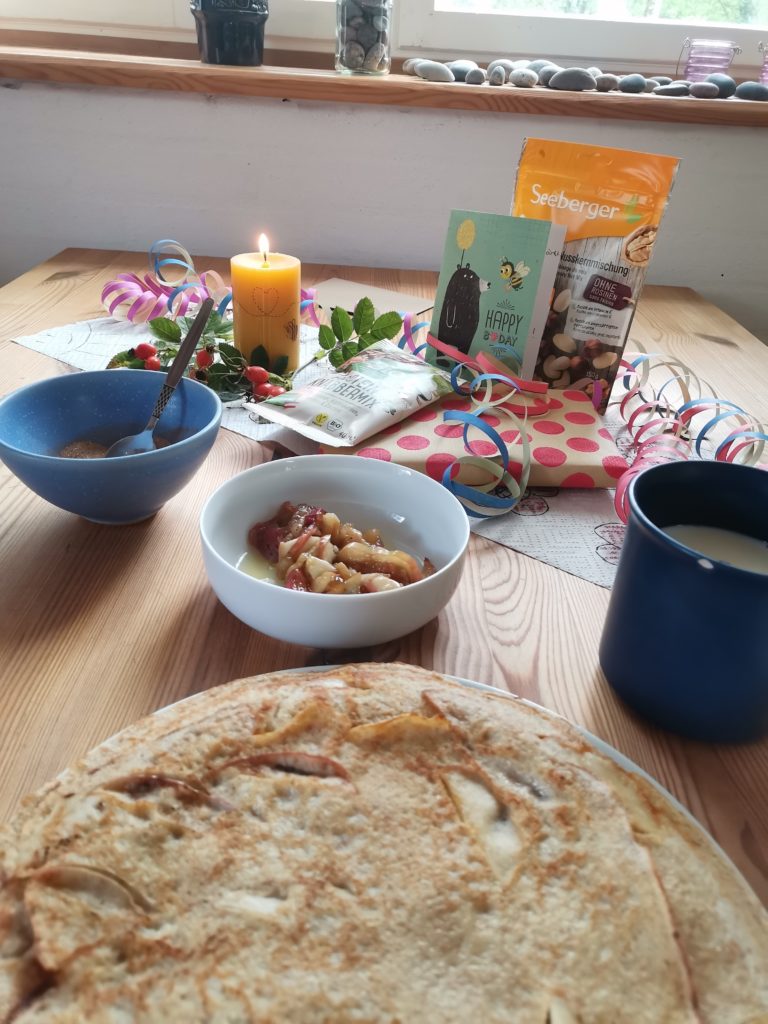 Das war heute ein schöner Tag! Er begann damit, dass Carmen am Herd stand und ich die Couch erst verlassen durfte, als das Frühstück auf dem Geburtstagstisch stand. Apfel-Eierkuchen, mmmh lecker. Geschenke gab’s auch, bei dem einen bin ich schon auf Seite 48.