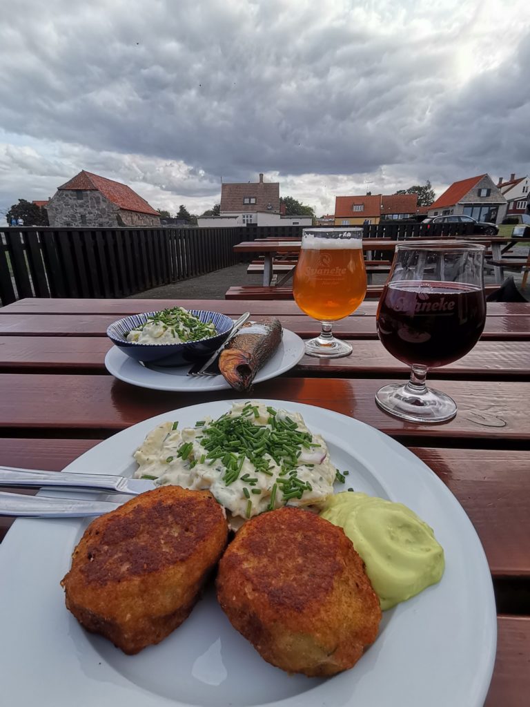 Krönender Abschluss des Svaneke-Besuchs war dann das Abendbrot in der Fischräucherei. Hier habe ich mich an der Bornholmer Spezialität, geräuchertem Hering versucht, ich war aber nur mittelmäßig erfolgreich. Möglicherweise gibt es auf Bornholm ein Schulfach, in dem der Umgang mit geräuchertem Hering und seinen Gräten gelehrt wird.