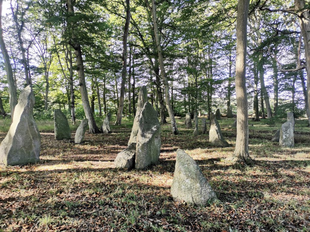 Wir stoppten am Louisenlund, einer der größten Ansammlungen von Bautasteinen Dänemarks und idyllisch in einem kleinen Wäldchen gelegen. Bautasteine sind unbeschriftete und in der Regel unbehauene große, schlanke Steine, die um etwa 1100 v. Chr. über Gräbern, an Grabhügeln oder anderen bedeutenden Orten einzeln oder in Gruppen aufgerichtet wurden. Ein gängiger Begriff ist auch Menhir, Asterix-Fans ist er natürlich als Hinkelstein bekannt.