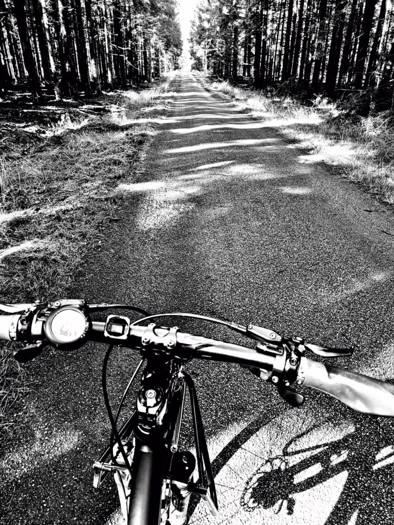 Am Parkplatz Oksemyrevejen an den Paradisbakkernen stellten wir das Auto ab und nahmen die Räder Richtung Aakirkeby. Es ging immer schön durch den Wald, gefühlt mehr bergab als bergauf – es rollte gut – aber es war schon merklich kühler als die letzten Tage. Wieder war es sehr windig, aber diesmal hatten wir sogar Rückenwind.