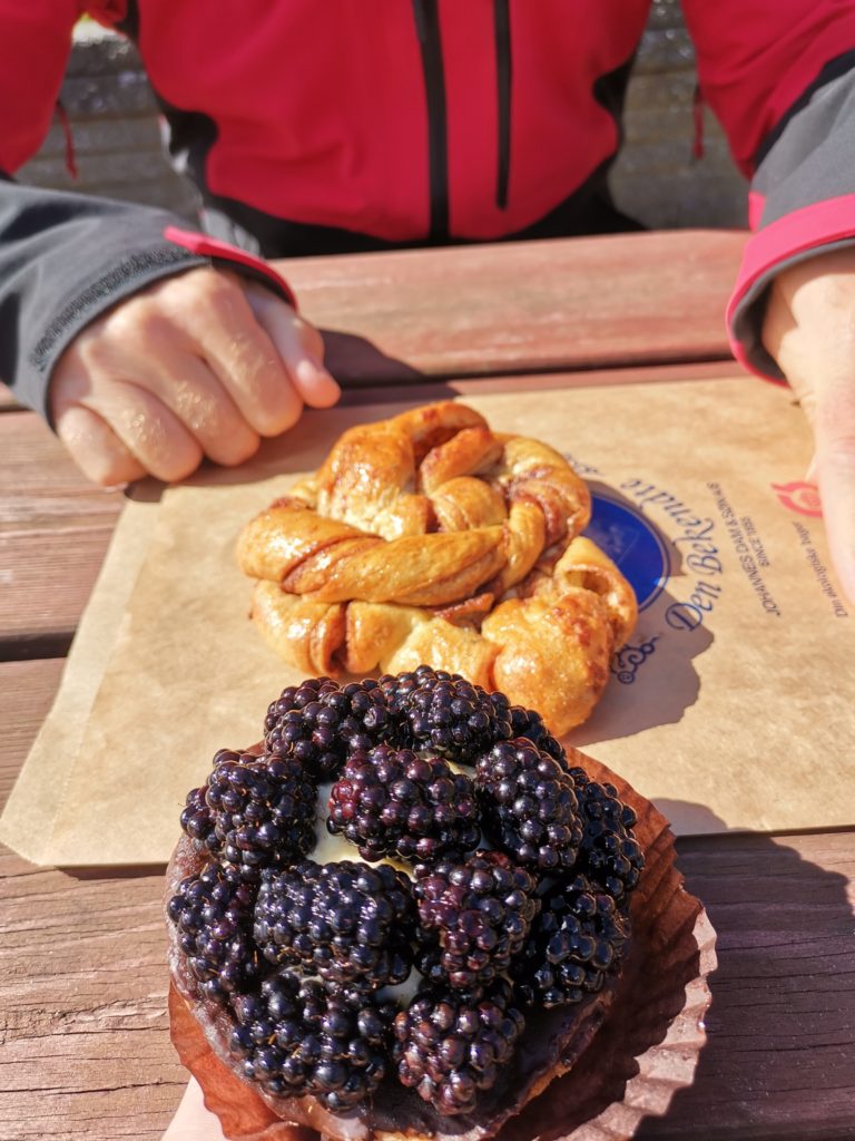 Anschließend radelten wir zurück nach Vang. Der letzte Teil war herrlich… immer schön bergab. Dort angekommen gab es in einem Café am Hafen tatsächlich richtigen selbstgebackenen Kuchen – Rhabarber und Apfel mit Streuseln. Geht doch!
