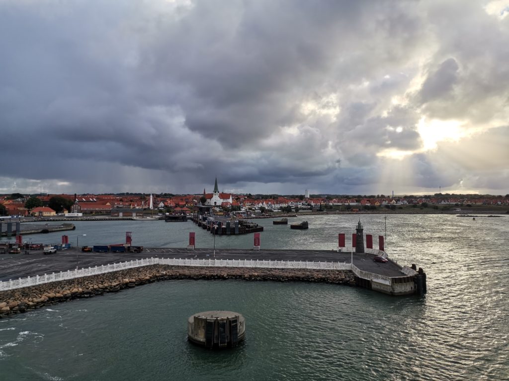Die Fahrt zum Hafen nach Rønne verläuft entspannt, es sind kaum Autos unterwegs. Nach knapp 40 Minuten sind wir da und reihen uns in die wartende Autoschlange ein. Erst werden noch Container entladen.