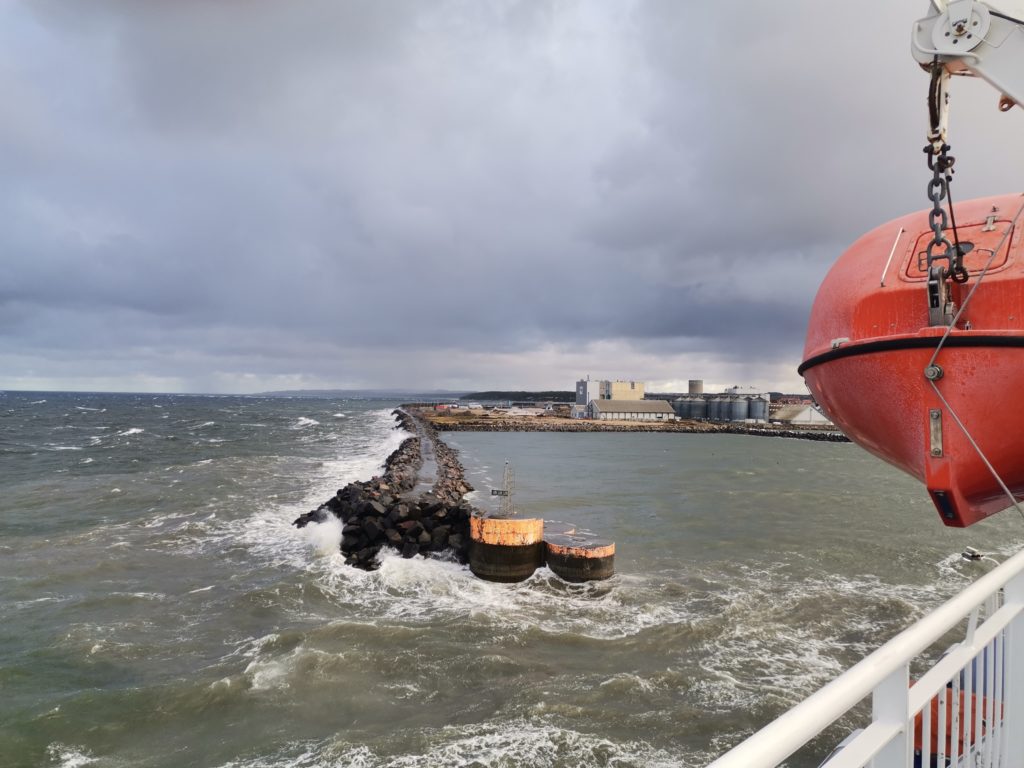 Während Bernhard in der Lounge Platz nimmt (wir haben Fensterplätze ergattert), gehe ich an Deck um mir die Abfahrt anzuschauen. Bei dem Sturm ist das ein richtiges Spektakel. Ich muss mich festhalten um nicht umgepustet zu werden. Die Insel wird immer kleiner. Die Wellen brechen an der Fähre und spritzen teilweise bis aufs Deck. Eine spritzt so sehr, dass sie mich mit komplett nasser Hose zurück lässt. Zeit für die Lounge und unser eingepacktes Frühstück.