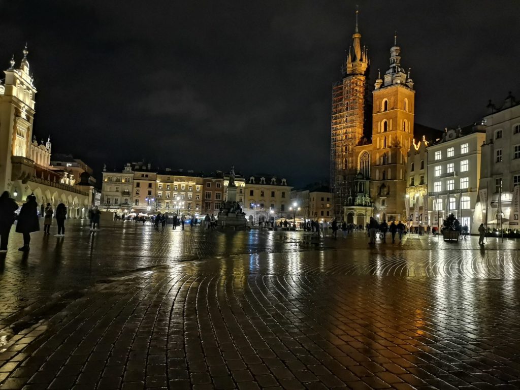 Der Hauptmarkt (Rynek Główny), das Zentrum der historischen Altstadt, ist ein Platz mit einer Größe von 200 mal 200 Metern, der rundherum von Restaurants und Cafés gesäumt ist. Neben dem Turm des alten Rathauses und einer klitzekleinen Kirche befinden sich in der Mitte des Marktplatzes die Tuchhallen, ein Gebäude in dem früher mit Tuch gehandelt wurde. Heute kann man dort Andenken und Kunsthandwerk kaufen.