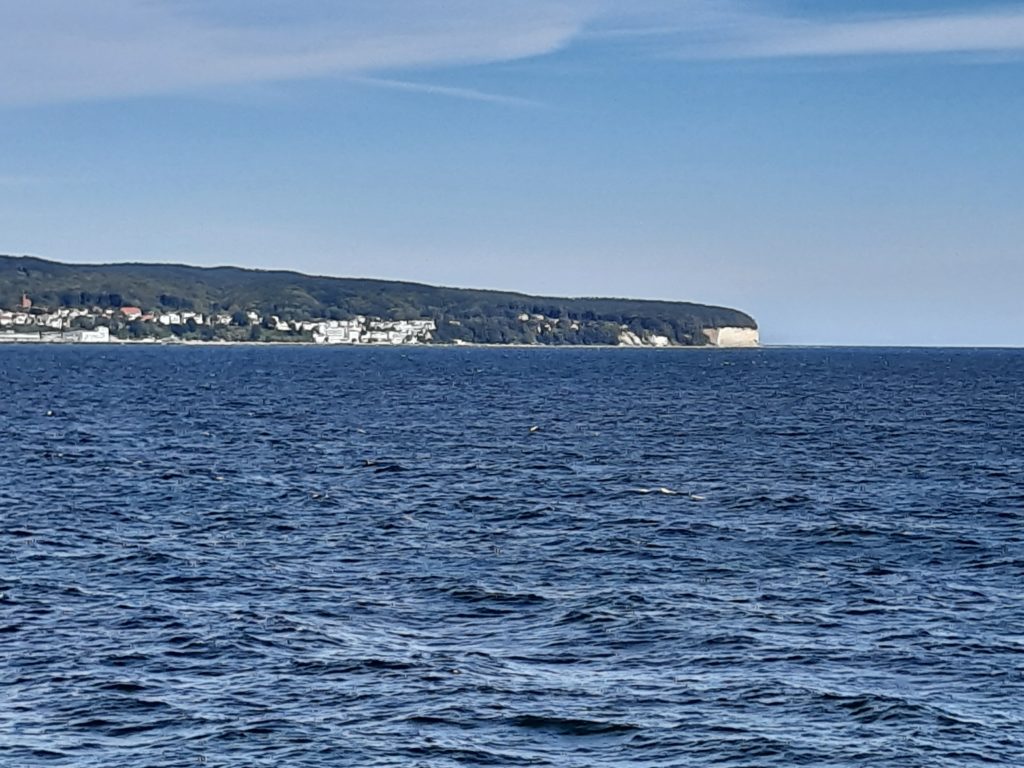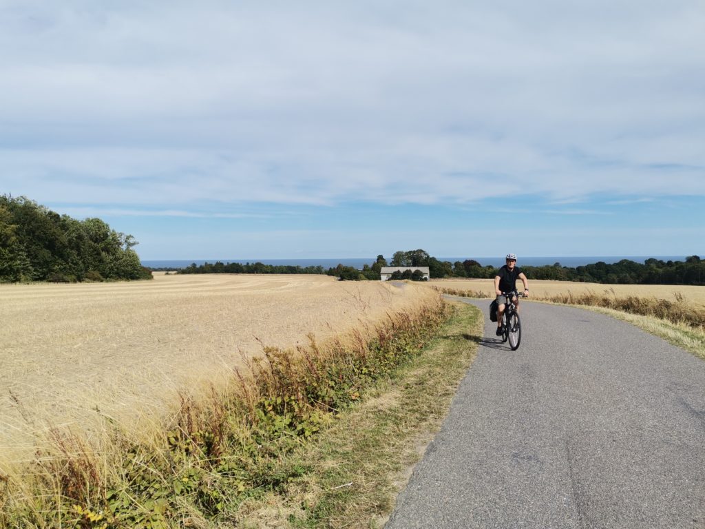 Dann sattelten wir die Räder und radelten die Küstenstraße entlang Richtung Gudhjem. Es war sonnig und angenehmes kurze-Hosen-und-T-Shirt-Wetter. Die Ostsee rechts von uns und links gelbe Stoppelfelder ging es bergauf und bergab.