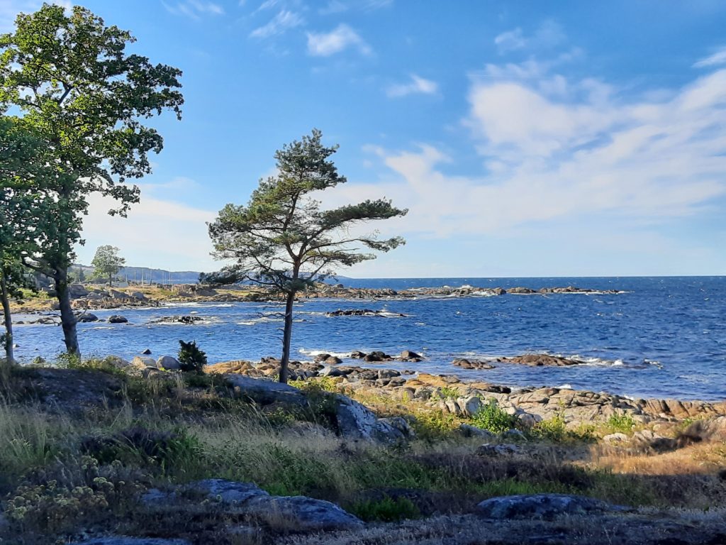 Nachdem Bernhard endlich den Stromkasten außen am Haus gefunden hatte und den Zählerstand ablesen konnte sind wir noch die 5 Minuten zur Küste spaziert und anschließend durch den kleinen Ort Listed. Die Küste ist felsig und von schroffem Charme. Überall stehen Bänke oder auch Picknicktische zum Verweilen. Im Ort hängen die Bäume und Sträucher voller Früchte, es gibt prächtige Feigenbäume und die Menschen grüßen freundlich mit Hej, Hej.
