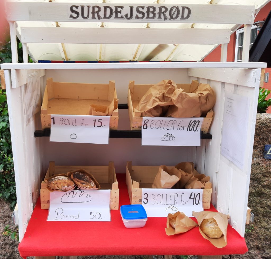 Statt zum Brötchenholen nach Svaneke zu radeln, machte ich es wie Bernhard gestern: ich ging 350 Meter die Straße entlang zum Selbstbedienungsstand, wo es täglich ab 08:30 Uhr frisch gebackene Sauerteigbrötchen und -brot gibt. Eigentlich mag ich die Variante mit dem Fahrrad lieber… die Ostsee links, Felder rechts, bergauf, bergab, dann die Windmühle am Ortseingang und die hübschen Gassen im morgens noch etwas verschlafenen Ort.
