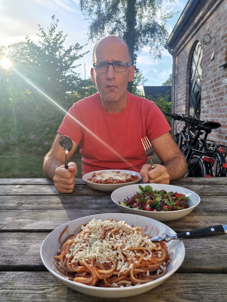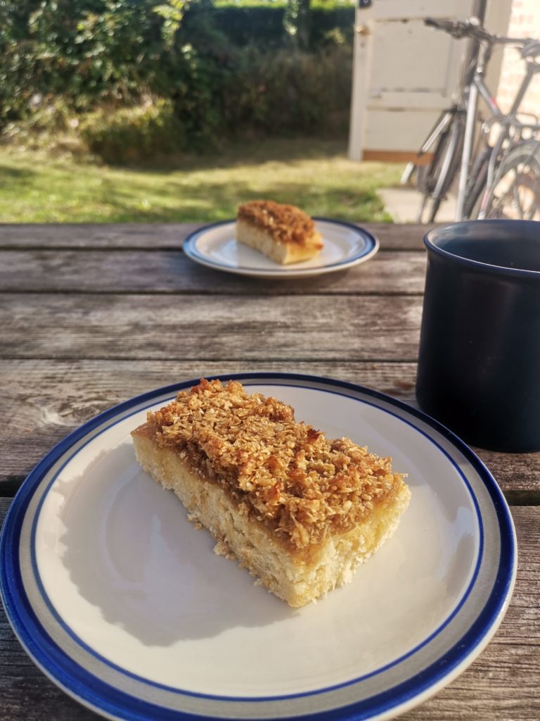 Nach so vielen Mühlen hatten wir uns Kuchen verdient. Wir lagen gut in der Zeit und waren gegen dreiviertel drei am Imbiss in Svaneke, der neben Burgern, Hotdogs und Pommes auch mit „hjemmebagt kage“ (hausgemachtem Kuchen) auf einem Schild wirbt. Es gab aber keinen. Er war nicht bereits alle – nein – es gab einfach keinen. Schnell radelten wir zu unserem Brötchenstand. Dort hatten sie, als wir heute Morgen aufgebrochen sind, ein Schild angebracht und mit Kaffee und Kuchen geworben. Als wir um drei ankamen wurde gerade das Schild abgebaut und das Verkaufsfenster war bereits geschlossen. Aber sie hatten noch genau zwei Stück übrig – Glück gehabt! Bei strahlendem Sonnenschein haben wir uns den Kokoskuchen vor unserem Ferienhaus schmecken lassen.