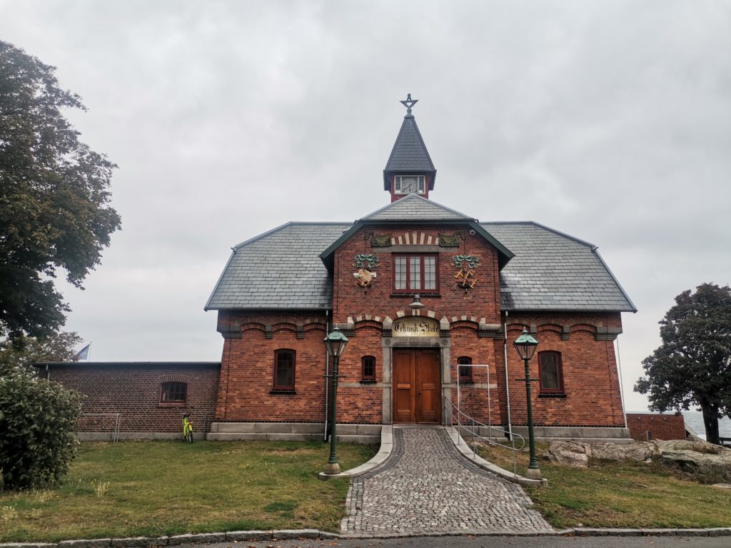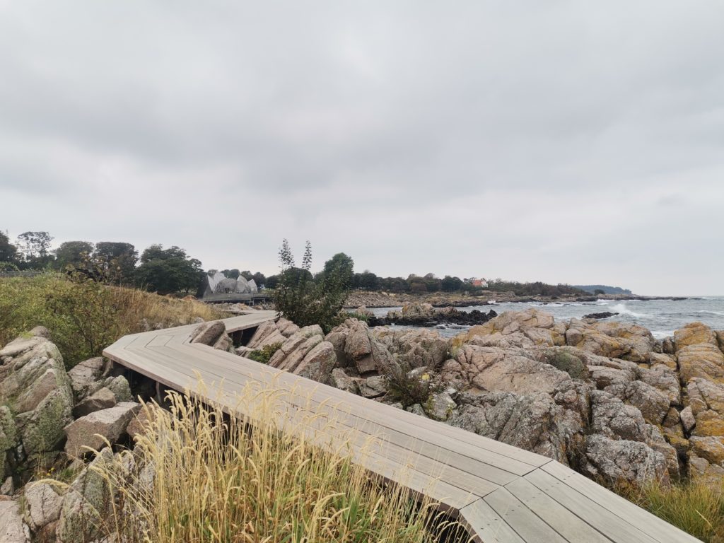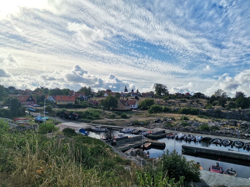 Unseren ersten kurzen Stopp machten wir im Ortsteil Allinge. Hier gibt es, wie soll es anders sein, einen Hafen und ein paar bunte Häuschen in den Gassen, aber auch einige größere Hotels im weitläufigen Gebiet der mittlerweile aus zwei Orten zusammengewachsenen Stadt. Die Einkaufsstraße befindet sich direkt am Hafen. Im Ort gibt es eine Schweizer Konditorei, die macht aber schon um 12 zu, für uns gab es hier also nichts zu holen. Besonders gefallen haben uns die schön verzierte Technische Schule, ein Tagungszentrum, welches fast komplett aus Holz besteht und ein hölzerner Pfad durch die Felsen an der Küste.