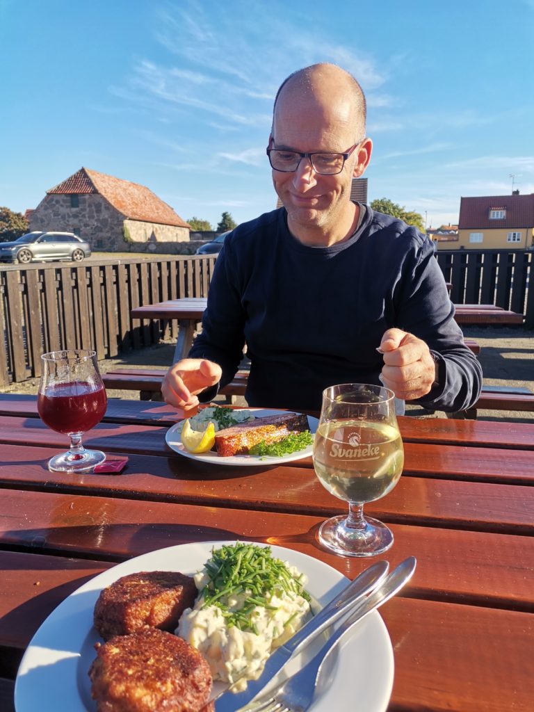 Ratz fatz sind wir zurück in Svaneke und belohnen uns mit einem Abendessen in der lokalen Fischräucherei. Bernhard fragt die Verkäuferin in perfektem dänisch, ob sie deutsch spricht und das tut sie tatsächlich fließend. Noch dazu ist sie super nett.