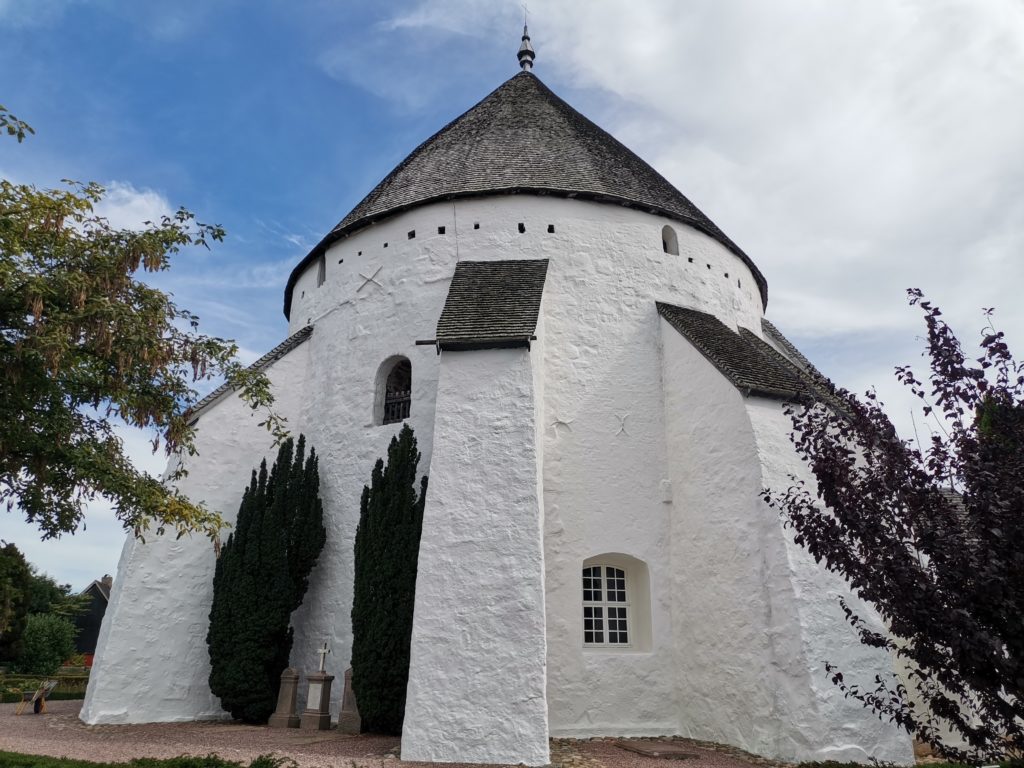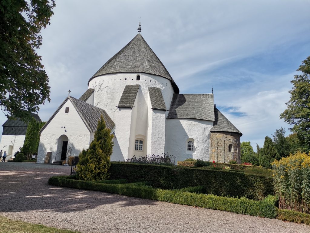Warum die Kirche (Kirke) rund ist, dazu gibt es verschiedene Theorien. Am besten hat uns die gefallen, dass es ein Wehrturm war. Die exponierte Lage, die mächtigen Mauern und die inneren Mauerringe mit Schießscharten, die man beim Begehen der oberen Etagen sehen kann passen gut zu dieser Überlegung. Ursprünglich hatte die Kirche auch kein Dach, so dass sie tatsächlich wie ein Turm aussah. Allerdings wurden in der Umgebung nie Speerspitzen oder ähnliches gefunden, so dass diese Theorie entweder doch nicht stimmt oder die Kirche nie angegriffen wurde.