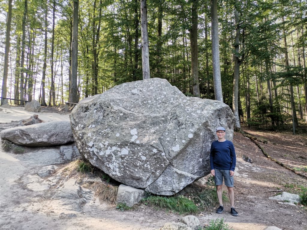 Abgekämpft erreichten wir unser Ziel, einen Wanderpparkplatz direkt bei den Paradieshügeln. Von hier aus starteten wir unsere Wanderung, die uns zuerst über spärlich mit Heidekraut, Faul- und Vogelbeerbäumen bewachsene Felsen führte. Später ging es dann durch zuerst dichten, dann lichteren Wald zum ersten Highlight des Tages, dem Wackelstein. Dies ist ein 30 bis 35 Tonnen schwerer Granitblock, den man, wenn man an der richtigen Stelle rüttelt, zum Wackeln bringen kann. Carmen hat dies auch locker geschafft. Eine der sieben Schulklassen, die uns auf der Wanderung begegneten, hat versucht, den Wackelstein gemeinsam umzukippen, glücklicherweise ist ihnen das nicht gelungen.