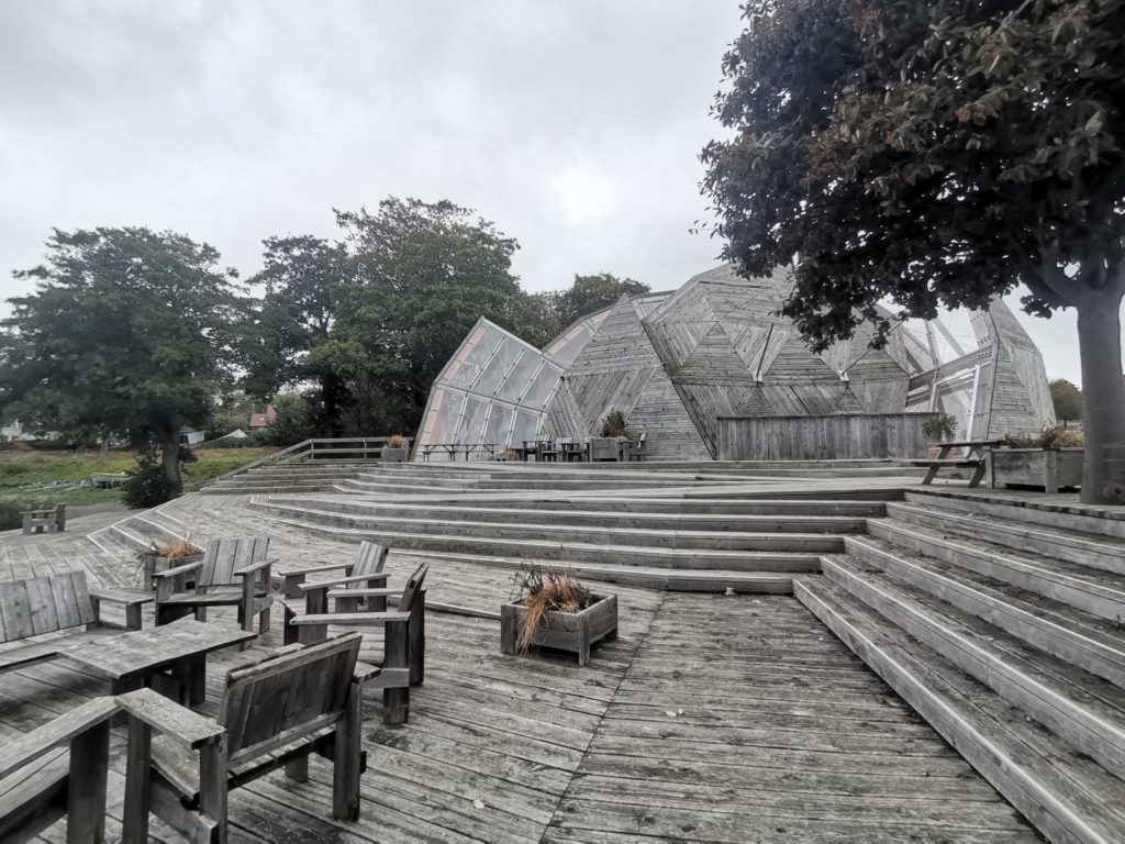 Café Nummer eins war bereits in der Winterpause, Café Nummer zwei ebenso. In den beiden Eisläden konnten wir keinen Kuchen entdecken. Es sah also nicht gut aus. Da erspähte ich auf dem Schild vor einem Restaurant „kaffe og kage“ (Kaffee und Kuchen). Die Bedienung teilte uns allerdings mit, dass sie nur „Danish apple cake“ hätten, was eigentlich kein Kuchen, sondern eher ein Kompott sei. Besser als nichts, dachten wir uns und wurden belohnt. Es war Apfelkompott mit karamellisierten Schichten aus irgendwelchen Krümeln, Schlagsahne und Fruchtsoße – hübsch angerichtet in einem bauchigen Glas. Dazu eine Stempelkanne Kaffee. Lecker!