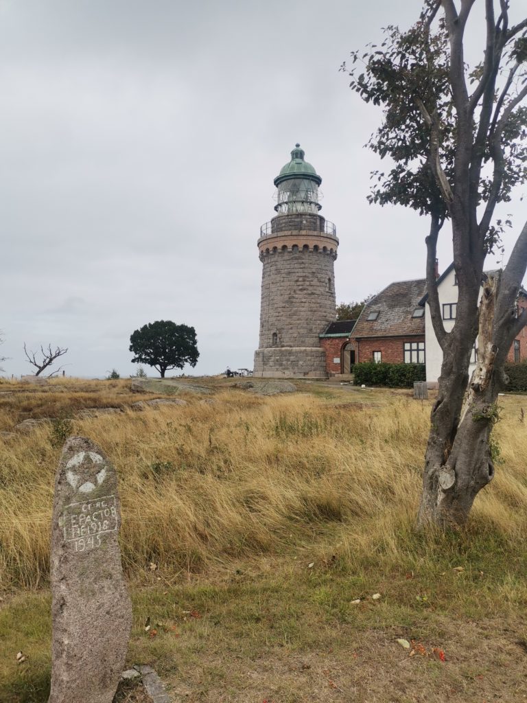Dann fuhren wir weiter nach Sandvig. Wir parkten in Strandnähe, es gibt hier tatsächlich einen richtigen Sandstrand! Unweit davon begannen wir unsere Wanderung über die Halbinsel Hammeren, welche uns zuerst an der Küste entlangführte. Wir passierten einen Leuchtturm und nachdem wir uns an der Küste an den schönen rund- und glattgeschliffenen Steinen erfreut hatten, liefen wir weiter zur Salomons kapel. Hier befinden sich die Überreste einer Kapelle vom Anfang des 14. Jahrhunderts. Von dort aus ging es bergauf zum Hammer fyr. Diesen Leuchtturm, ein ganzes Stück über dem Meer gelegen, kann man besichtigen und von der Aussichtsplattform den Blick über die Ostsee und einen Teil der Insel genießen.