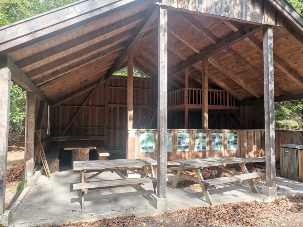 Im Pedersker Wald, durch den es sich herrlich radeln ließ, kamen wir an einer feudalen Hütte vorbei. Es gab einen Grill, Feuerholz, Pferdeparkplätze und ich würde sagen zwei Ebenen zum Schlafen (da bin ich mir aber nicht ganz sicher) sowie ein Plumpsklo mit selbstabsenkendem Klodeckel. Sie hieß dann auch passenderweise Jagdhütte.