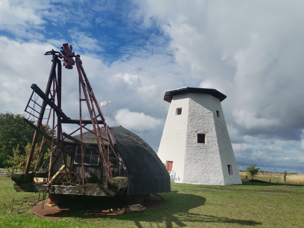 Von der Myreagre Mølle (1865 – 1970) stand nur der Turm. Die drehbare Haube war abgenommen und lag daneben. Es sah aus, als würde sie für eine Sanierung bereit liegen.