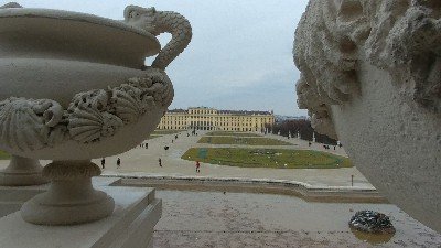 Nur die in exakte geometrische Körper geschittenen Eiben und Lebensbäume sorgten für etwas Abwechslung. Sobald es Frühling wird ist es bestimmt wunderschön hier. Dann ging es rein ins Schloss. Ist ja ein riesiger Komplex und dabei war es nur die Sommerresidenz des österreichischen Kaiserhauses. Der gesamte Hofstaat umfasste so um die 1.500 Personen. Wir liefen mit Audio-Guides durch die verschiedenen Räume, sahen das Arbeitszimmer von Franzl (er war ein Arbeitstier), sein Sterbebett (er starb während des 1. Weltkrieges), sein Klo (ein englisches), Sissis Frisierzimmer und Privatgemächer, eingedeckte Speisezimmer, den Festsaal, viele Gemälde und wir liefen durch das Zimmer, wo Mozart als 6-jähriger seinen ersten Auftritt hatte. War wirklich ganz schön und interessant. Leider war es viel zu voll. Es waren lauter Gruppen hintereinander unterwegs und irgenwann wollten wir nur noch raus.